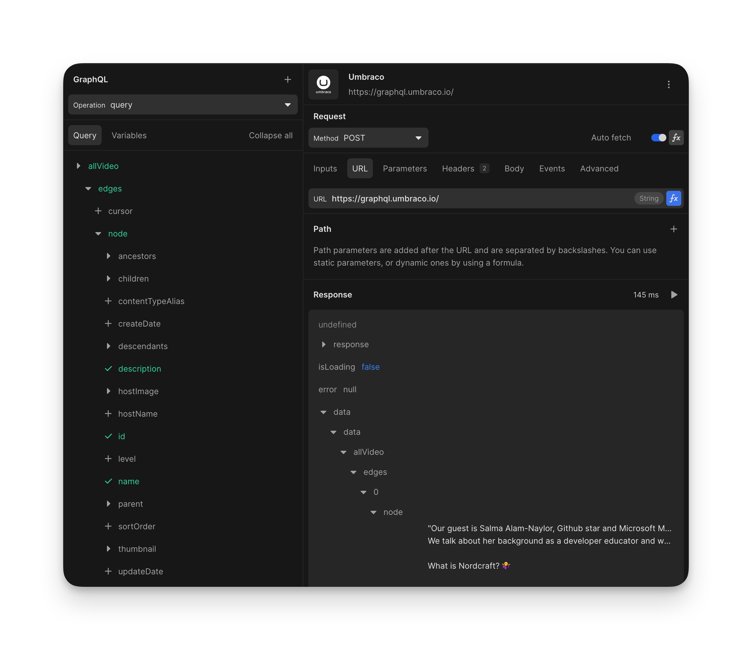 The new GraphQL query builder is live today. If you already use Nordcraft with GraphQL, the API panel will automatically detect this and show the new interface. Otherwise just click the GraphQL button in the body tab.