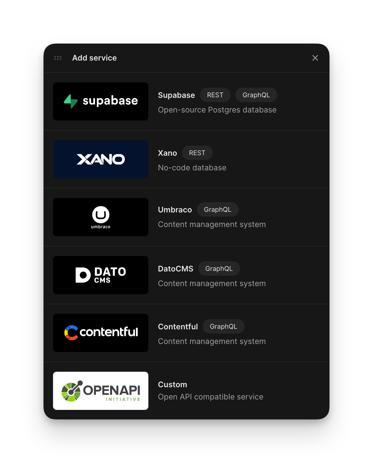 When you create new Service in Nordcraft you will now also see 3 new GraphQL services: DatoCMS, Umbraco and Contentful, and we also added support for Supabase GraphQL.